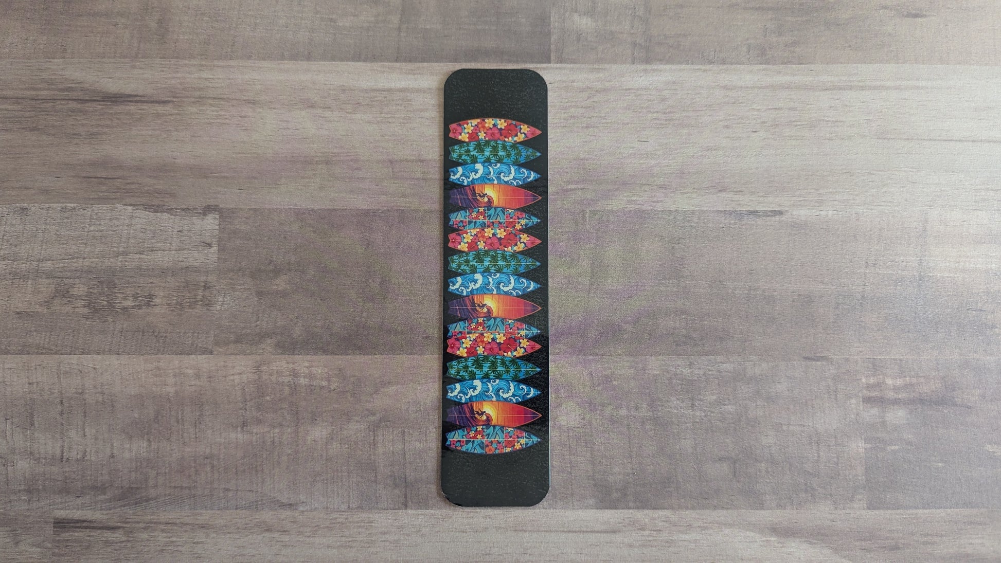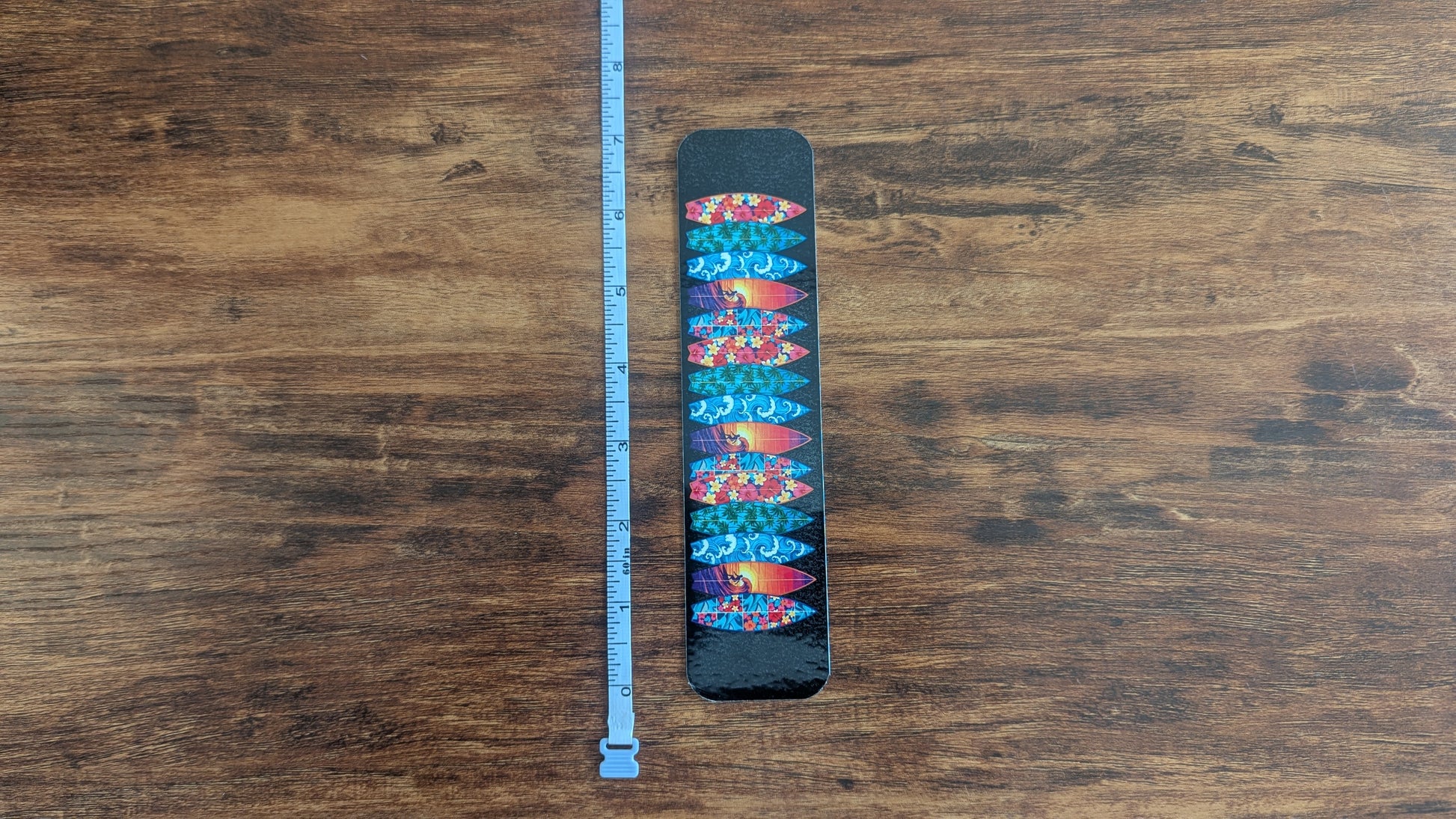 Our Colorful Surfboards bookmark is perfect for your beach read. The Colorful Surfboards bookmark is approximately 7" x 2 3/4" with a black background and colorful surfboards (each bookmark is hand cut by me so sizes are not exact). All bookmarks are printed on heavy duty card stock and laminated to make them durable and beach proof.