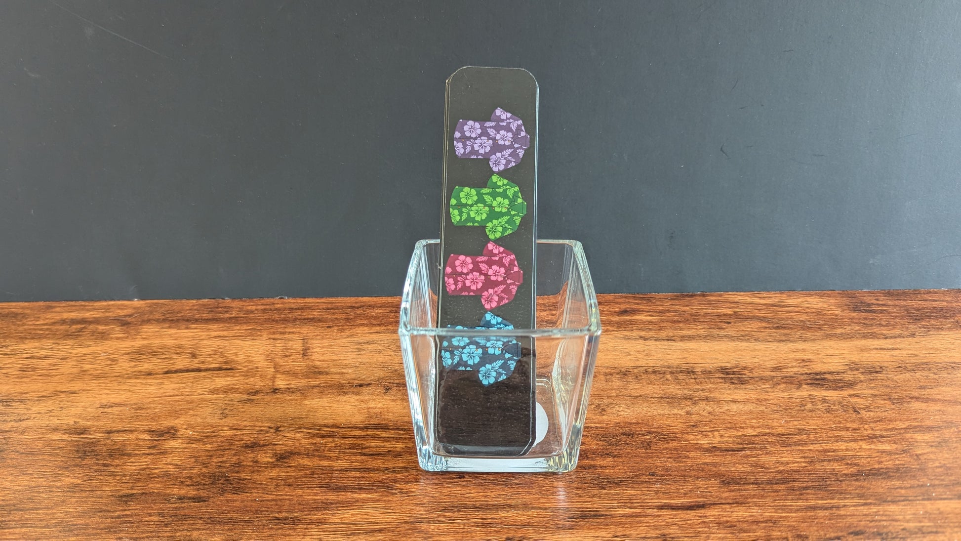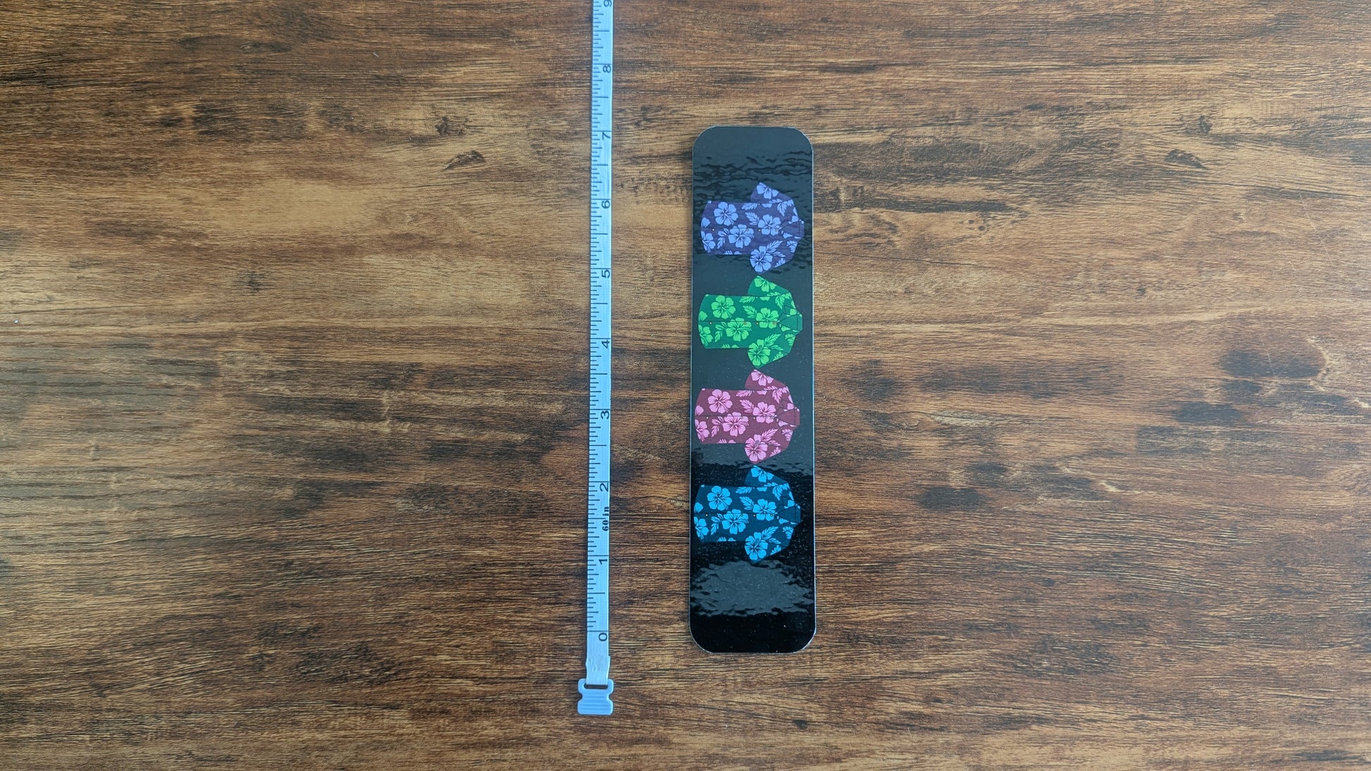 Our Hawaiian Shirts bookmark is perfect for your beach read. The Hawaiian Shirts bookmark is approximately 7" x 2 3/4" with a black background and colorful hawaiian shirts (each bookmark is hand cut by me so sizes are not exact). All bookmarks are printed on heavy duty card stock and laminated to make them durable and beach proof.