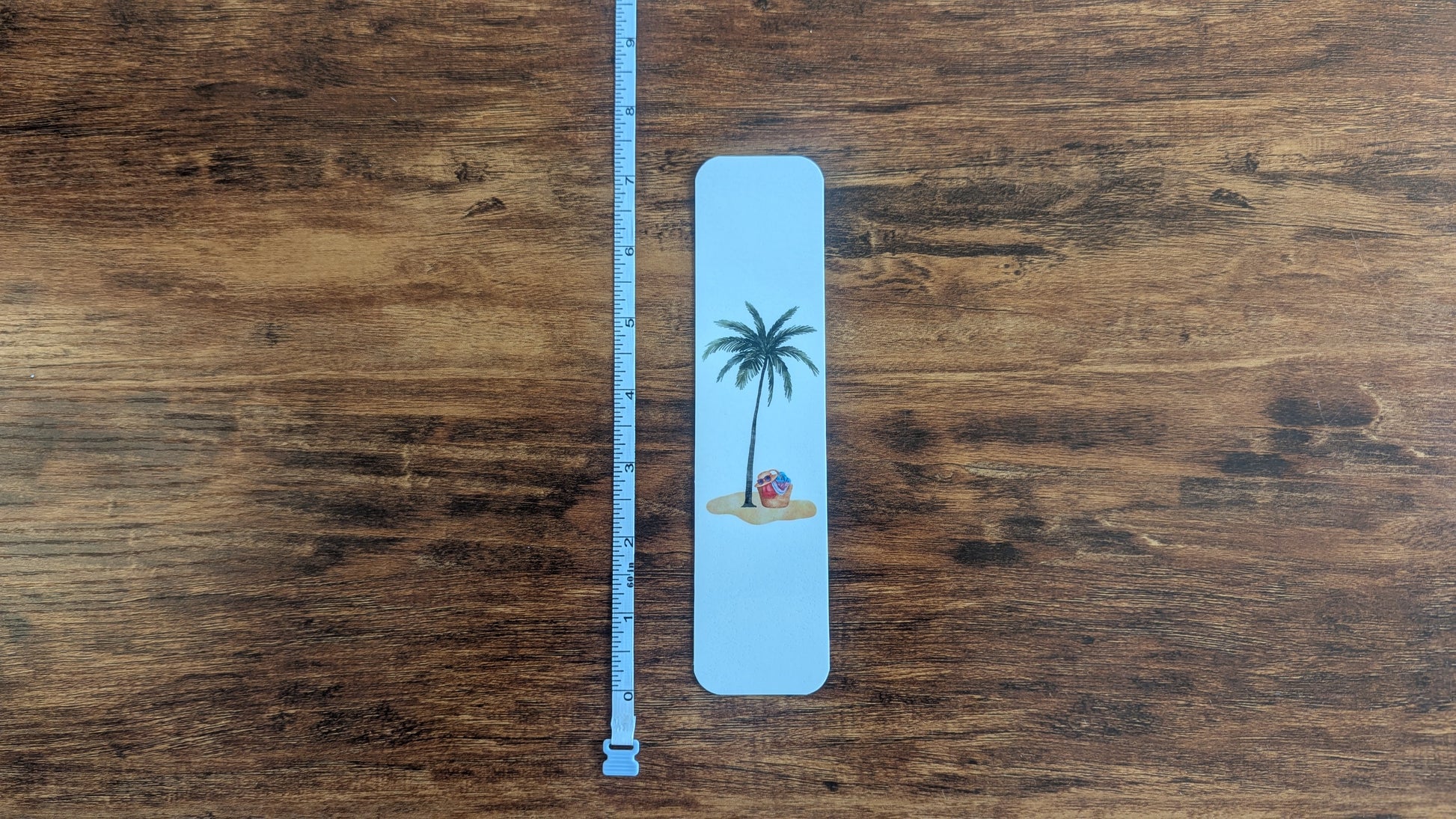 Our Palm Tree and Beach Toys bookmark is perfect for your beach read. The Palm Tree and Beach Toys bookmark is approximately 7" x 2 3/4" with a white background and colorful beach toys under a palm tree (each bookmark is hand cut by me so sizes are not exact). All bookmarks are printed on heavy duty card stock and laminated to make them durable and beach proof.