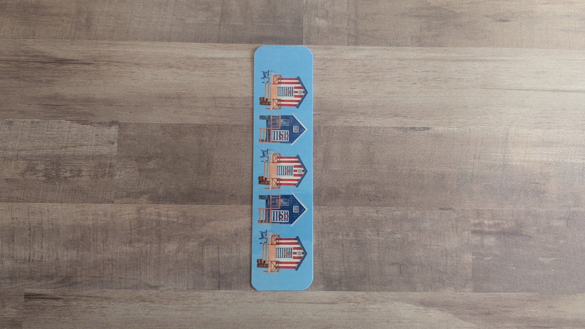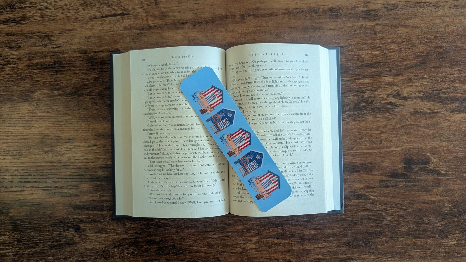 Our Patriotic Beach Huts bookmark V1 is perfect for your beach read. The Patriotic Beach Huts bookmark V1 is approximately 7" x 2 3/4" with a blue background and red, white, and blue beach huts (each bookmark is hand cut by me so sizes are not exact). All bookmarks are printed on heavy duty card stock and laminated to make them durable and beach proof.