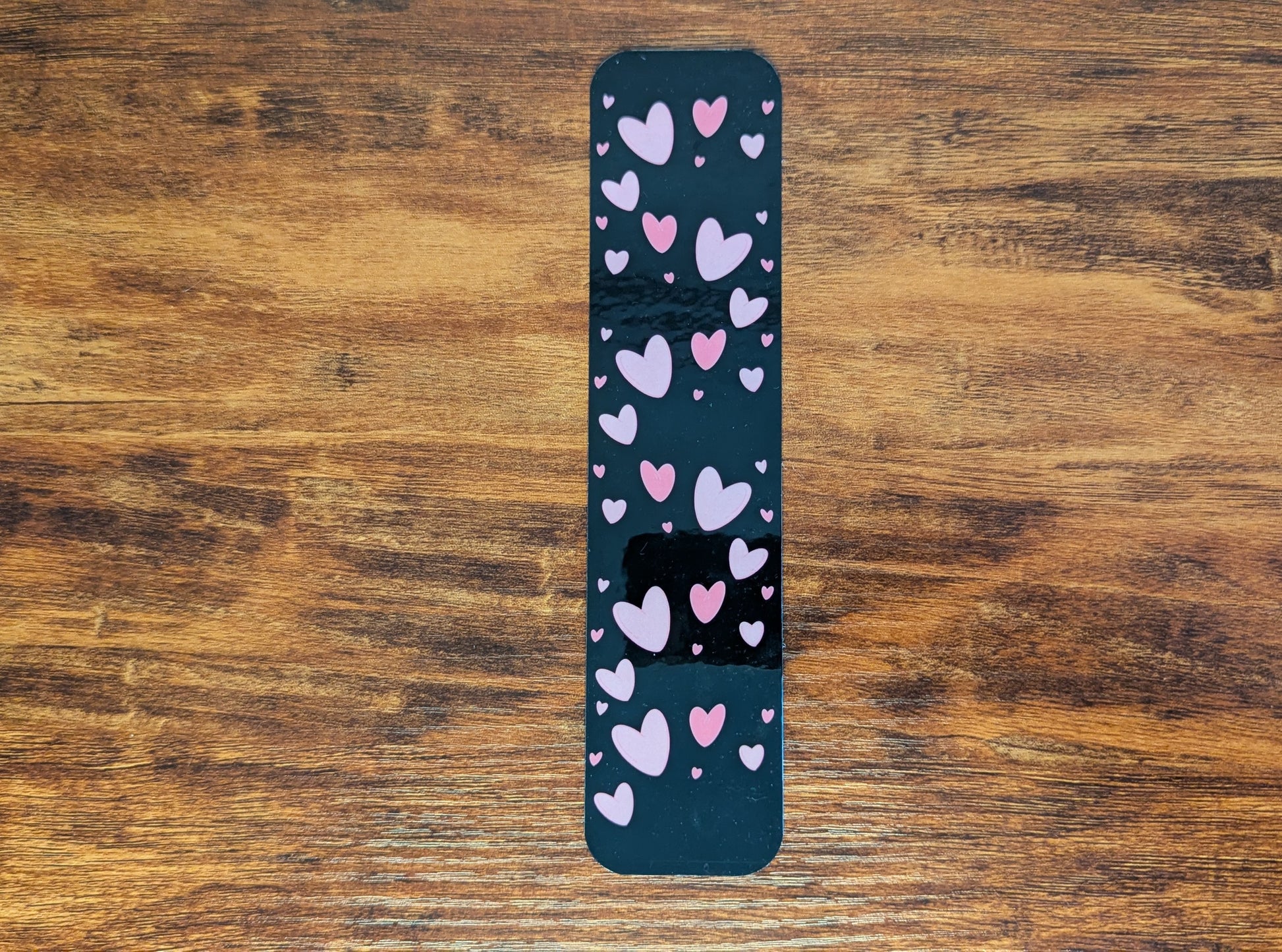 Our Pink Hearts on Black Background bookmark is perfect for all book lovers. The Pink Hearts on Black Background bookmark is approximately 7" x 2 3/4" with a black background and pink hearts(each bookmark is hand cut by me so sizes are not exact). All bookmarks are printed on heavy duty card stock and laminated to make them durable and long lasting.