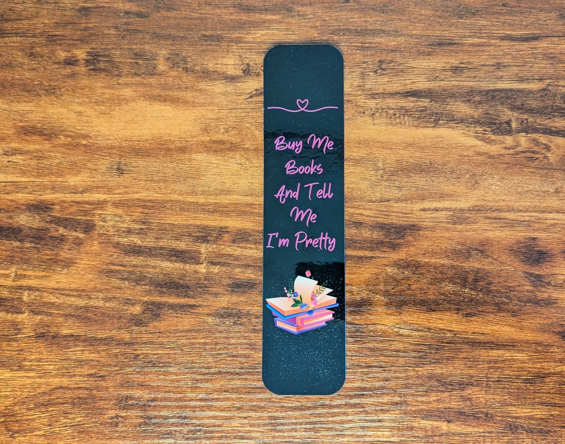 Our Tell Me I'm Pretty bookmark is perfect for all book lovers. The Tell Me I'm Pretty bookmark is approximately 7" x 2 3/4" with a black background and pink words(each bookmark is hand cut by me so sizes are not exact). All bookmarks are printed on heavy duty card stock and laminated to make them durable and long lasting.