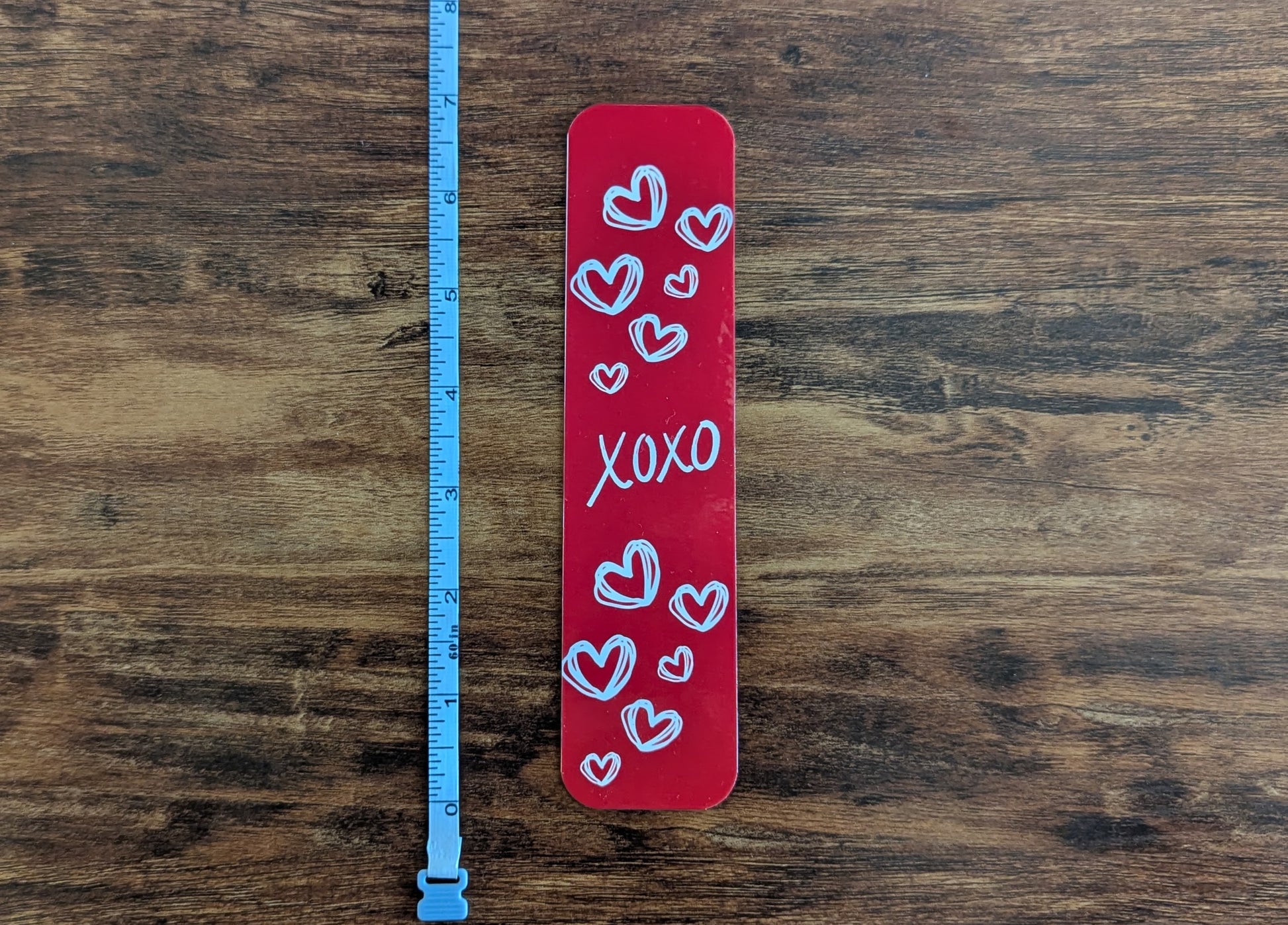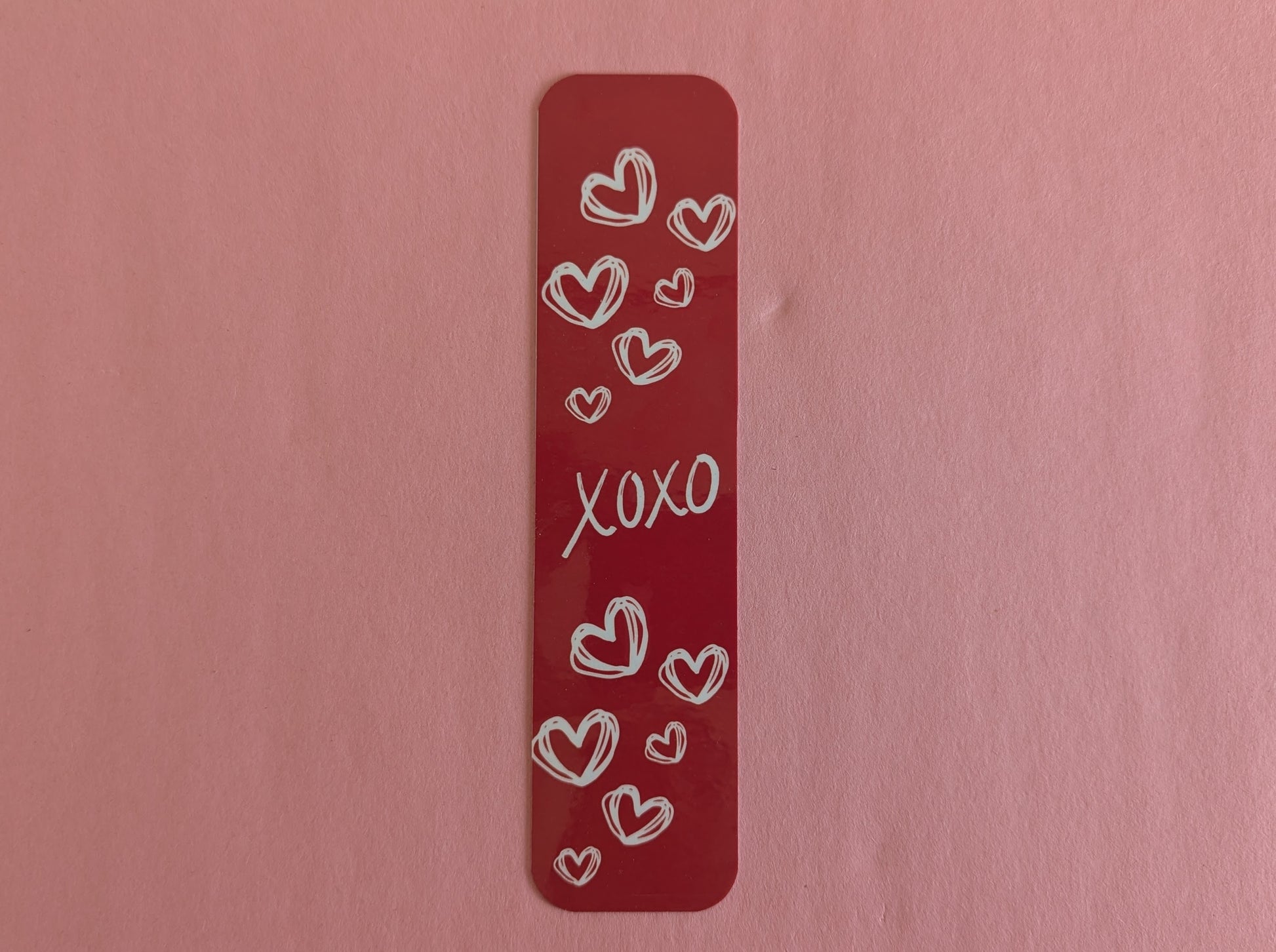 Our XO Valentine's Day bookmark helps wish your loved one a Happy Valentine's. The XO Valentine's Day bookmark is approximately 7" x 2 3/4" with red and white hearts (each bookmark is hand cut by me so sizes are not exact). All bookmarks are printed on heavy duty card stock and laminated to make them durable.